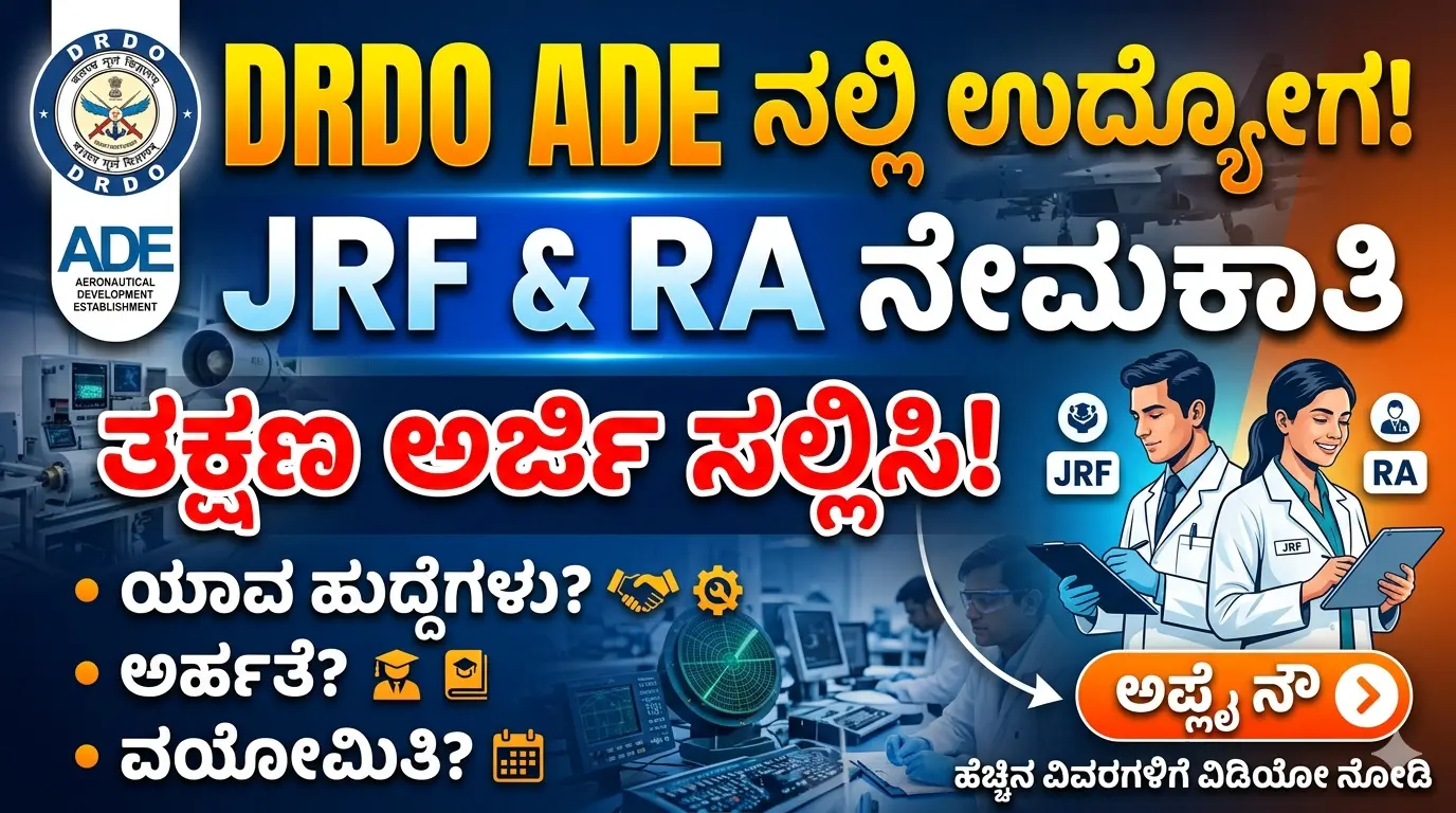 ಭಾರತದ ಪ್ರಮುಖ ರಕ್ಷಣಾ ಸಂಶೋಧನಾ ಸಂಸ್ಥೆಯಾದ DRDO ಅಡಿಯಲ್ಲಿ ಕಾರ್ಯನಿರ್ವಹಿಸುವ ADE ಲ್ಯಾಬ್ ಇದೀಗ Junior Research Fellow ಮತ್ತು Research Associate ಹುದ್ದೆಗಳಿಗಾಗಿ ನೇಮಕಾತಿ ಪ್ರಕಟಿಸಿದೆ. ಎಂಜಿನಿಯರಿಂಗ್ ಪದವಿ ಹೊಂದಿರುವ ಅಭ್ಯರ್ಥಿಗಳಿಗೆ ಇದು ಉತ್ತಮ ಅವಕಾಶವಾಗಿದ್ದು, ಆಸಕ್ತರು ಮಾರ್ಚ್ 24, 2026ರೊಳಗೆ ಅರ್ಜಿ ಸಲ್ಲಿಸಬಹುದು.